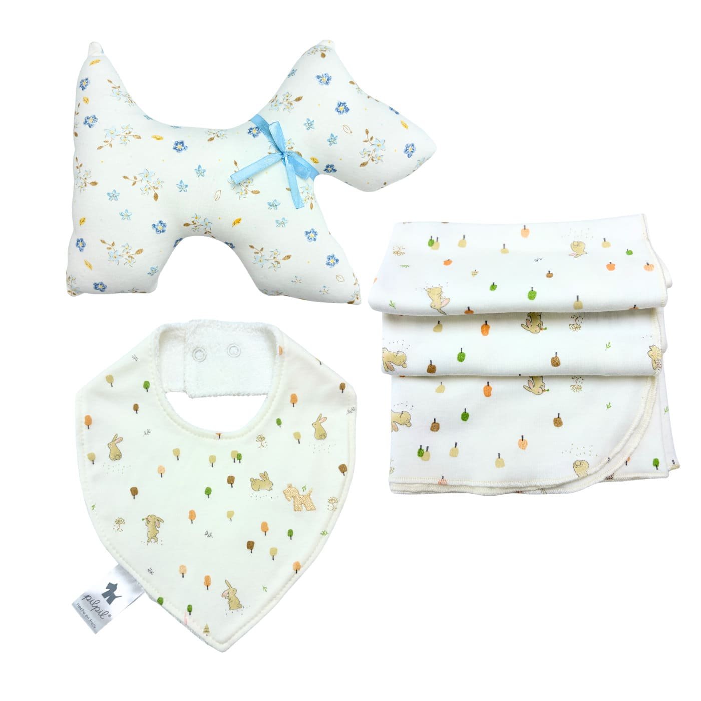 Hermosa Cajita de accesorios. Contiene: Babero unisex diseño conejitos, con doble broche libres de níquel, reverso en tela de toalla super absorbente MÁS Tuto con diseño conejitos tamaño grande de 65*65cm multi funcional, fácil de llevar a todo lado MÁS peluche Perrito diseño Primavera, tamaño aproximado de 15 de alto x 2 cm cm de largo, hecho a mano y será el compañero ideal para tu bebé, suave , tamaño perfecto, ideal para el momento que empiece a explorar objetos, texturas y colores. serán tus accesorios infaltables en el día a día con tu guagua.
