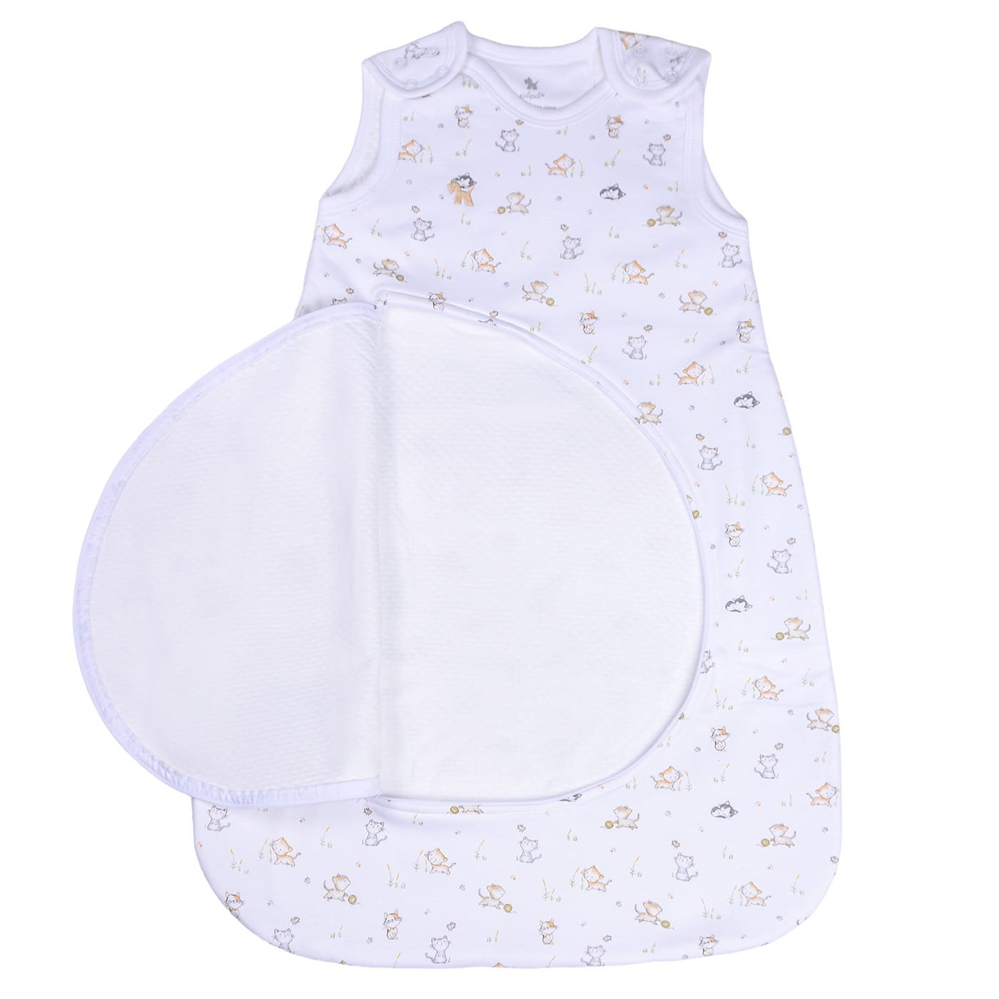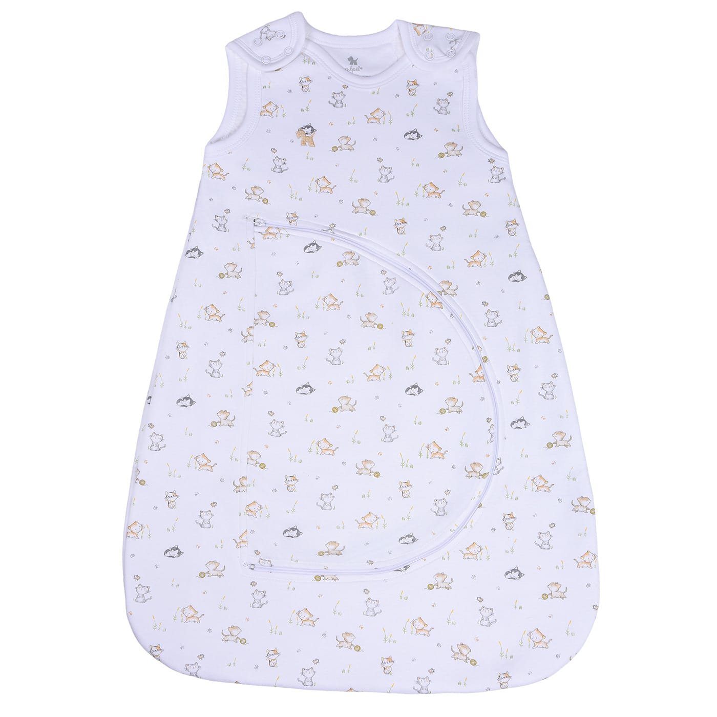 Saquito estampado estilo gotita con diseño de gatitos y fondo Blanco, su uso es desde RN hasta 10 meses aproximado, cuenta con doble broche en la parte superior para introducir al bebé y ajustarlo al crecimiento, con un cierre en el centro en forma de medialuna que facilita la muda del bebé para no despertarlo.
