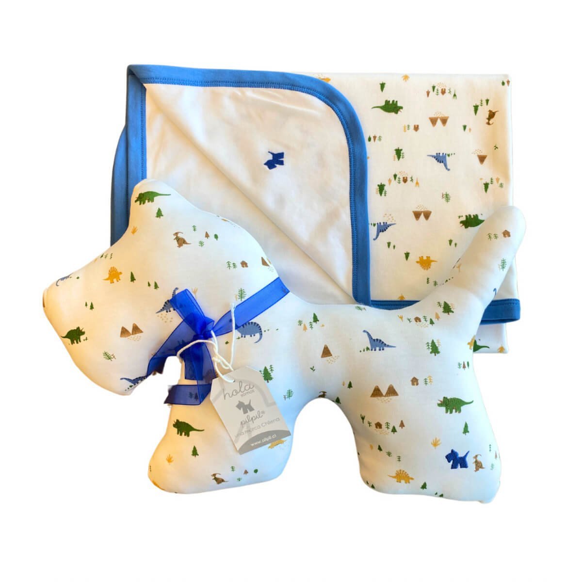 Pura ternura es nuestro set que incluye el perrito pilpil tamaño 32x39x12 + la manta diseño Dinosaurios y el reverso color blanco de 80x80cm, se convertirá en el compañerito de apego para sus tutos de tarde o idas de paseo, ideal para regalo de baby shower. Composición: 100% Algodón Pima Peruano. Instrucciones de Cuidado: Lavar con agua tibia y secar a baja temperatura. No usar cloro. Plancha tibia . Diseñado en Chile y fabricado en Perú