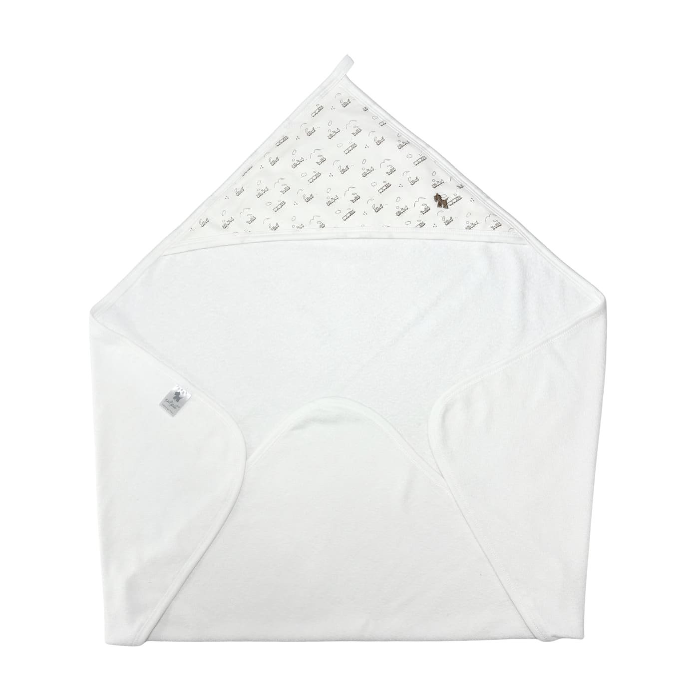 Toalla con capucha de algodón Pima estampado Trenes y fondo color Hueso de 80×70 cm, con tela de toalla ultra suave . Cuenta con una tira en el extremo de la capucha para ser colgarla, por su tamaño será un accesorio que durará hasta cuando tu guagua esté corriendo.